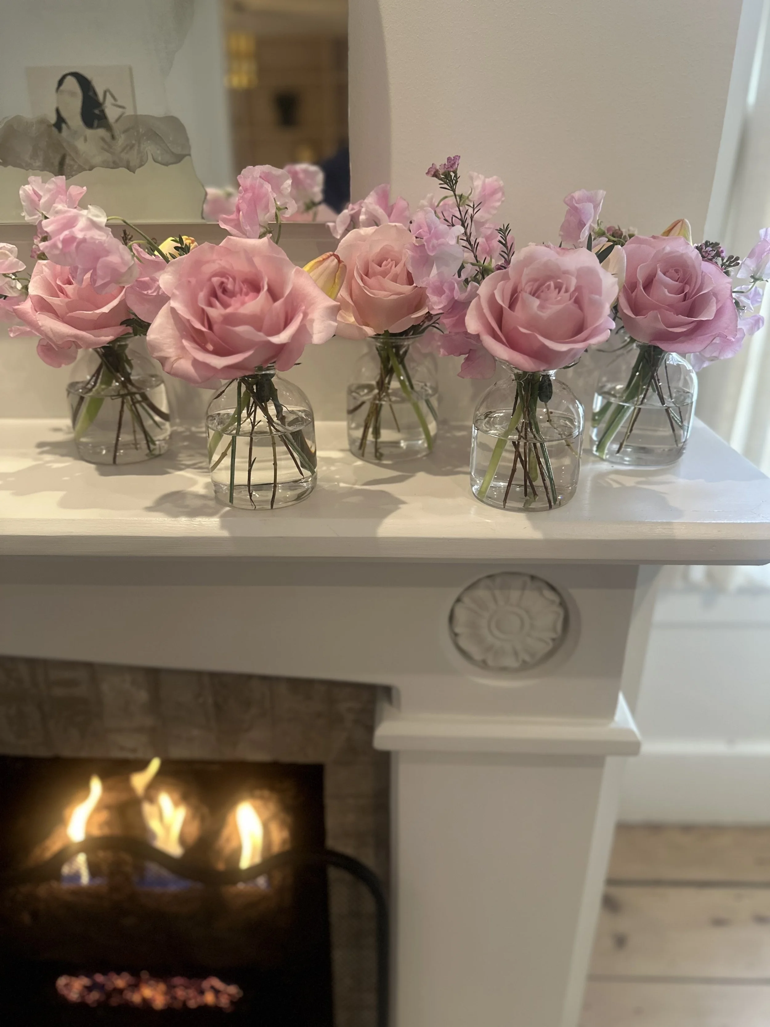 Five petite glass vases gathered with blush roses, sweet peas, and seasonal accents—each a small expression of affection, to be enjoyed together or throughout the home.
