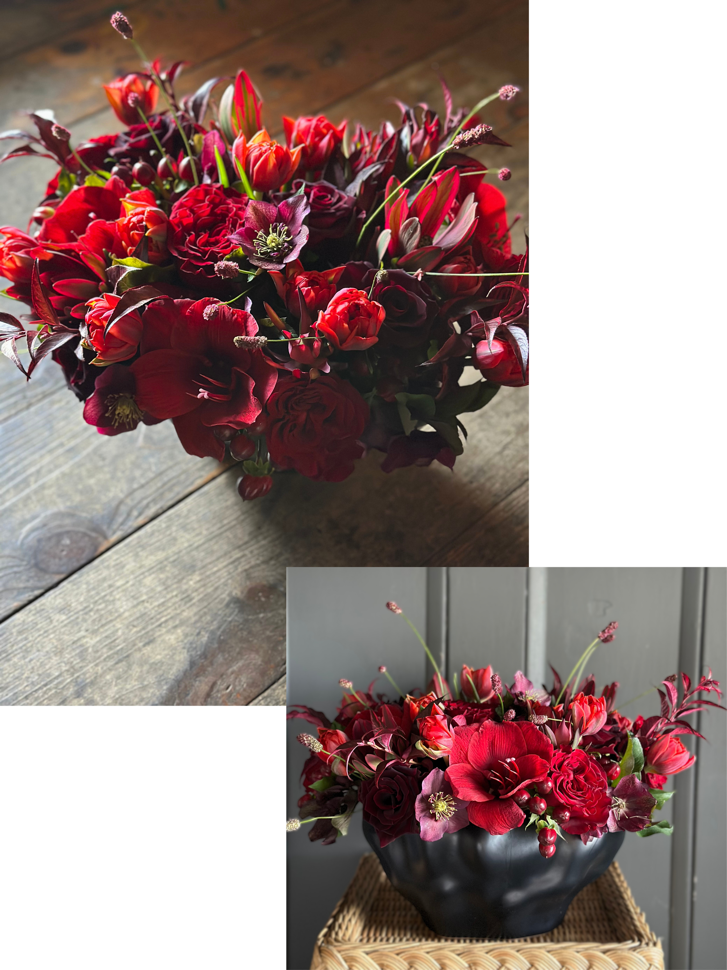 Merlot roses, cabernet amaryllis, claret tulips, and burgundy hellebore gathered in a stone-shaped ceramic vase—velvety layers softly woven with the gentle warmth of a well-loved red wine.