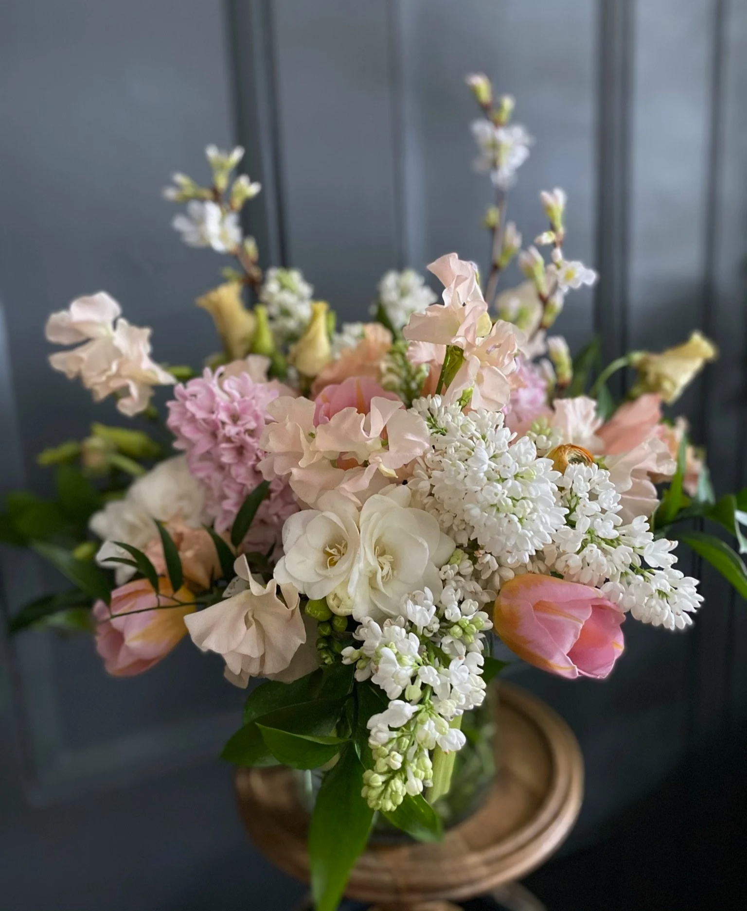 White lilac, pink tulips, hyacinth, blush sweet peas, lisianthus, and budding branches gathered in clear glass. Fragrant and softly layered, with a rhythm that lingers the way a melody does.